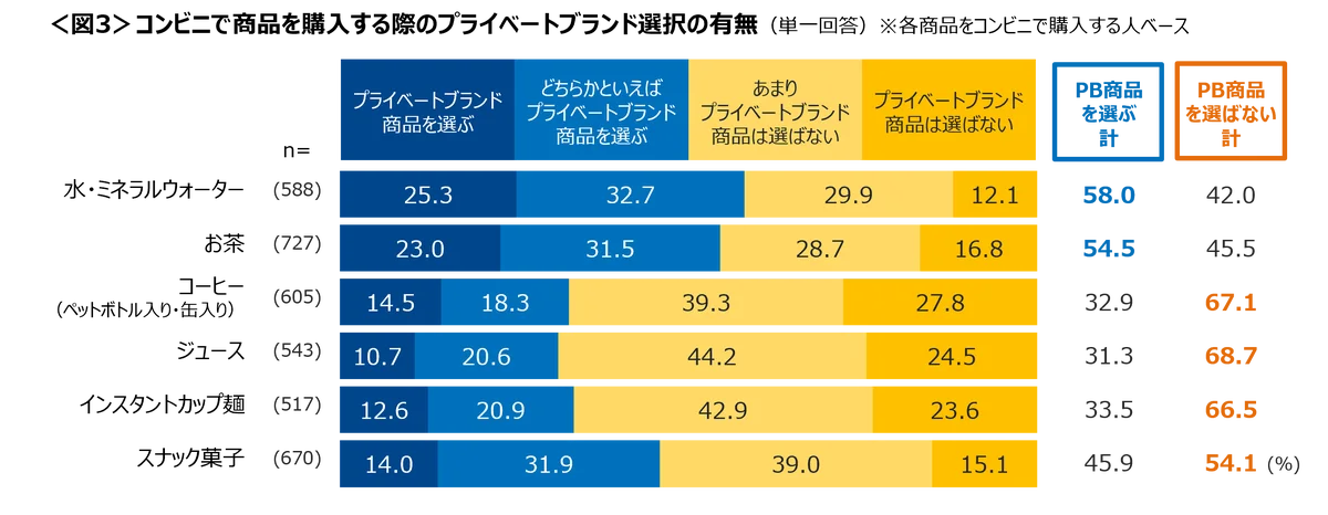 コンビニでどのような商品をプライベートブランドで購入するかについては、商品カテゴリーによって選択傾向が明確に分かれました。「水・ミネラルウォーター」「お茶」ではPB商品を選ぶ人が半数を超える