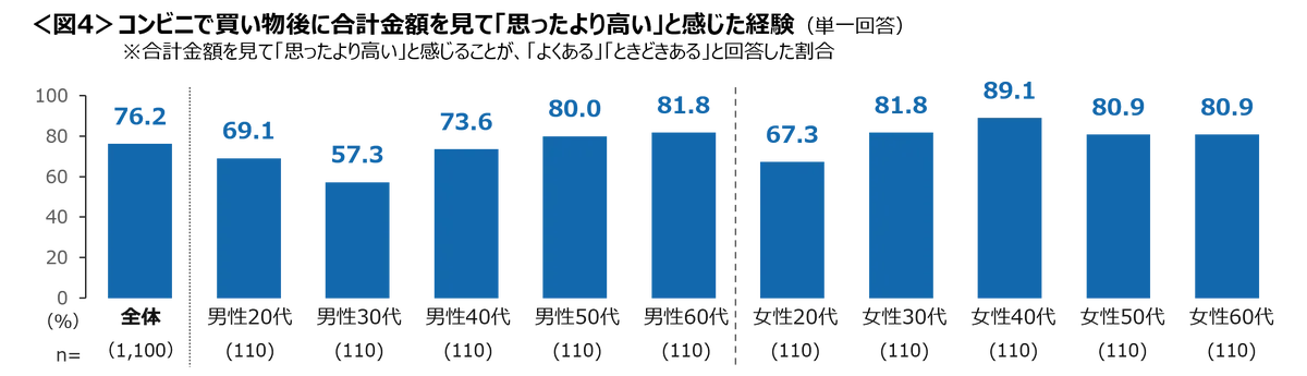 買い物後の割高感 「思ったより高い」と感じた人は76.2%。男性50~60代・女性40~60代は80%超