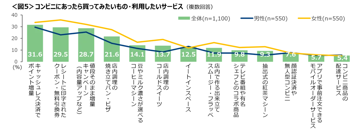 利用者は“お得感”を強く求めており、上位はキャッシュレスでのポイント増量、レシートクーポン・無料引換券、同価格で増量キャンペーン。女性は店内調理の焼き立て商品やスイーツにも関心が高い。