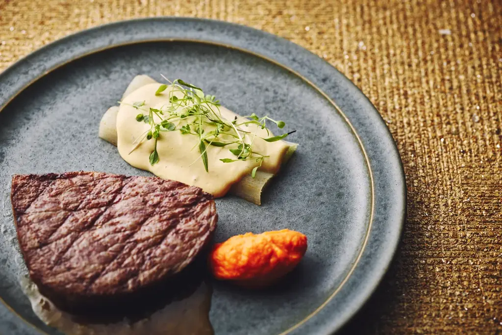 付け合わせにシンプルにボイルした独活(うど)を添え、みずみずしさとほろ苦さが肉の旨味を引き立てます。さらに梅干しを取り入れたオランデーズソースが繊細なコントラストをもたらします。