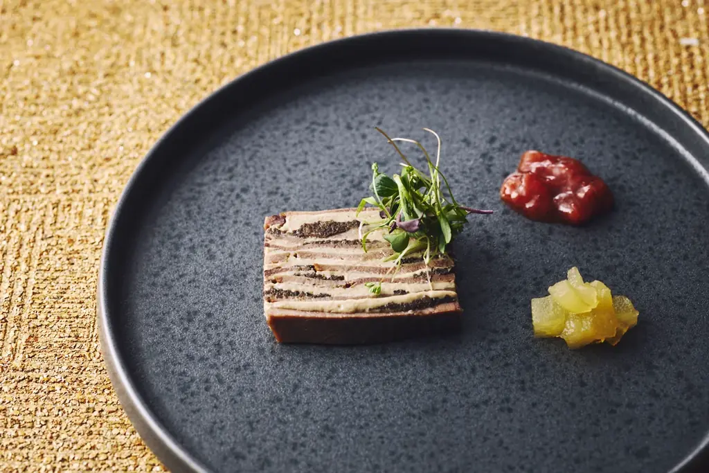 フランス・アルザス地方の伝統料理「ルクルス」をホテルインディゴらしく再構築。丁寧に火入れした牛タンを燻製にし、フォアグラムースと重ねてミルフィーユ状に仕立て、テリーヌに仕上げています。