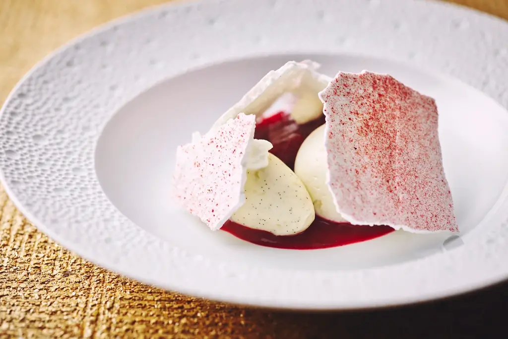 小田原産苺をワインでコンポートにし、フィラデルフィアクリームチーズのパルフェ、フランボワーズソース、メレンゲを重ねた華やかなデザートです。春らしい酸味と甘みがコースの締めくくりにふさわしい構成になっています。