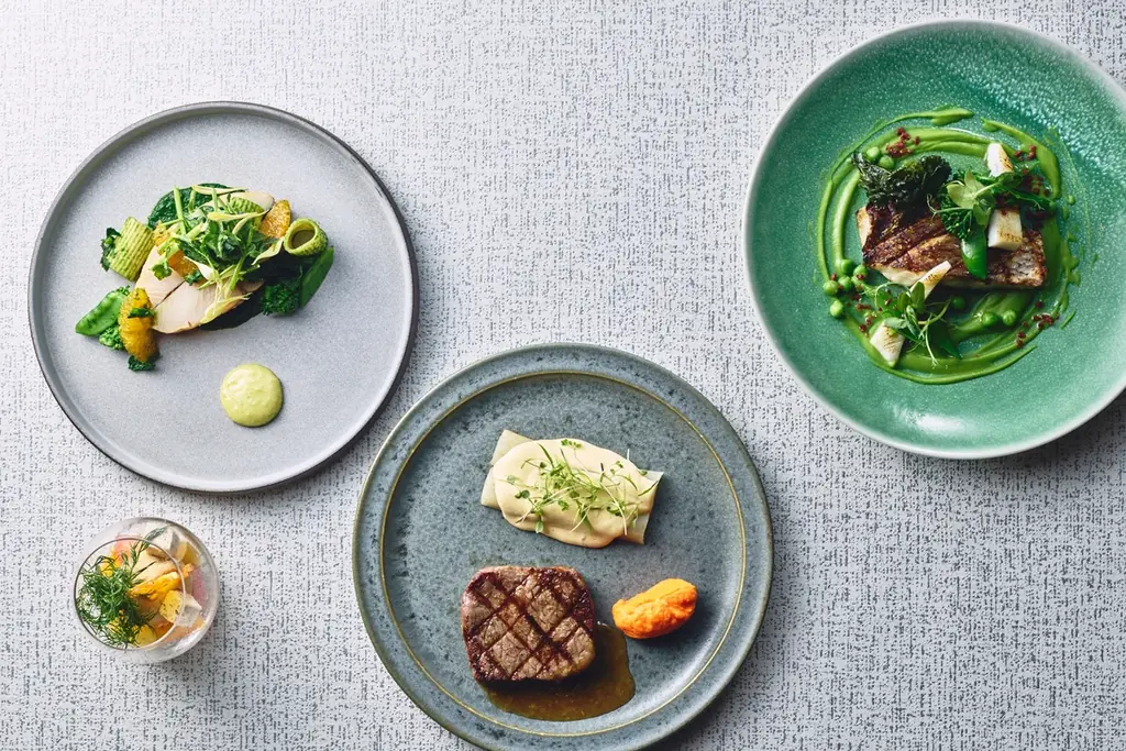 - シグネチャーコース:旬魚のグリルと国産牛の薪グリルを中心に、春の魚介と山菜、柑橘の爽やかさを重ねた構成(15,000円)。