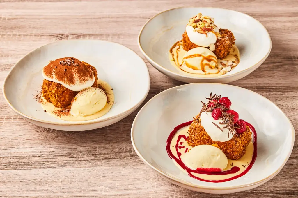 クリスピーブリオッシュフレンチトーストは、ブリオッシュ生地をあえて揚げることで外側がカリッと、中はとろとろに仕上げた新食感の一品です。揚げたてにバニラアイスが添えられ、濃厚なソースのように絡み合います。