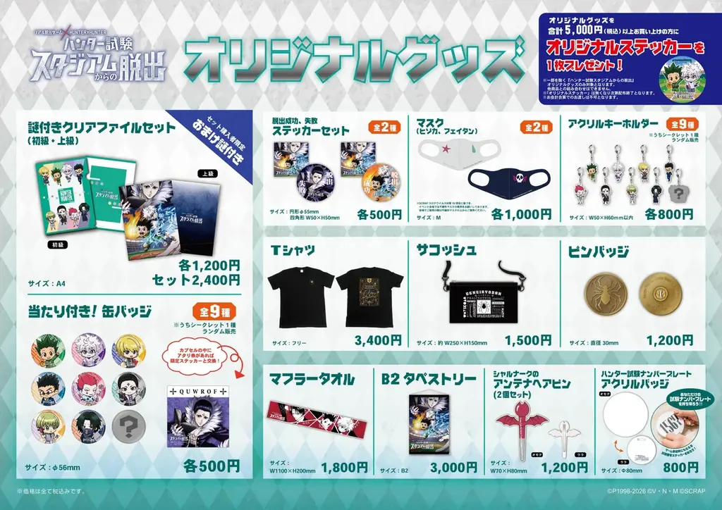 | オリジナルグッズ | 全12種(例:シャルナークのアンテナヘアピン、ハンター試験ナンバープレートアクリルバッジ) |