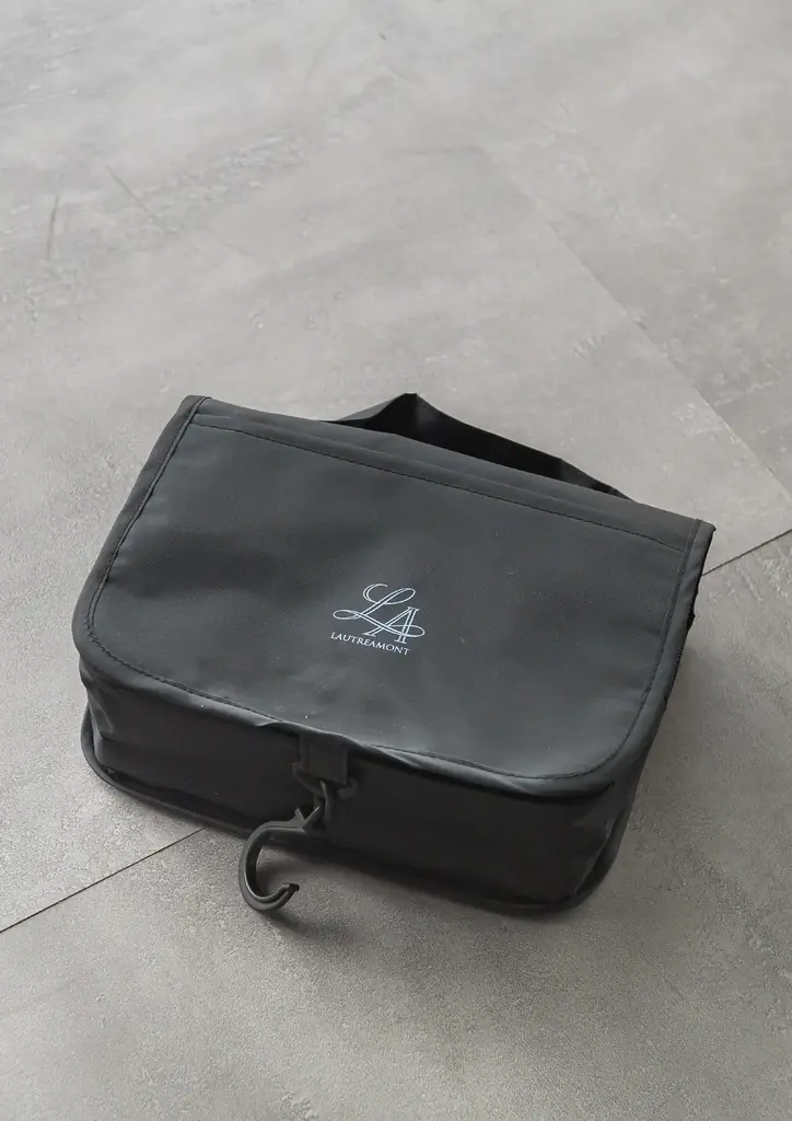 今回のノベルティはLAUTREAMONTのロゴ入りオリジナルトラベルポーチです。旅行先での使い勝手を重視した仕様で、ラックやフックに掛けられるようにフックが付属している点が特徴です。マチ(幅)を確保しているため、見た目以上に収納力があり実用的に設計されています。