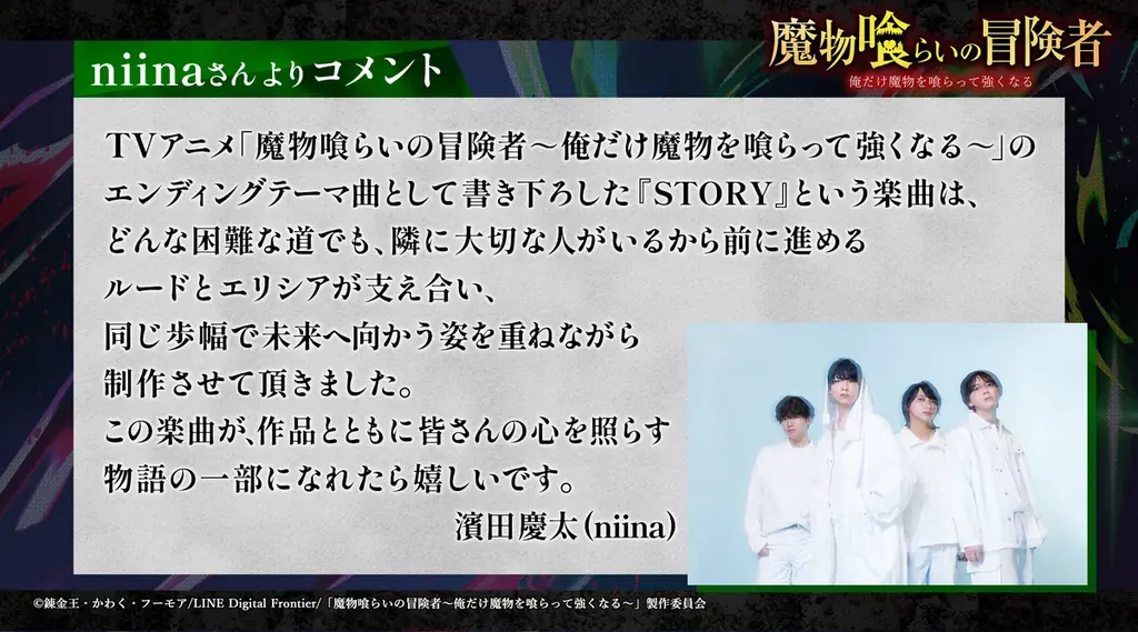 本作のエンディング(ED)楽曲は、福岡発の4ピースバンド「niina」による新曲『STORY』に決定しました。発表にあわせて、niinaはこれまでのソロプロジェクトからバンド体制への変更を公表しており、2026年3月より新体制での活動を開始しています。