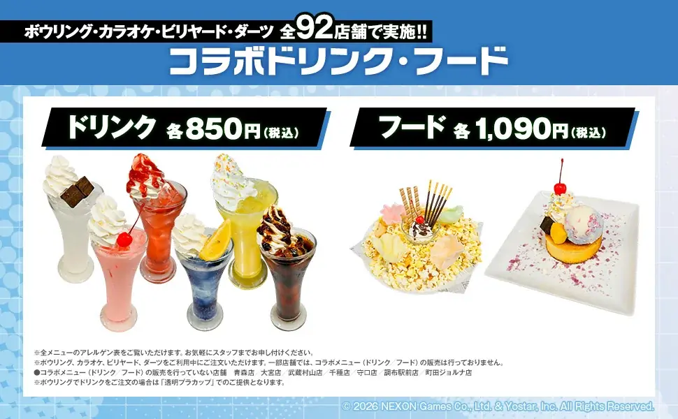 | コラボメニュー実施店舗数 | ボウリング92店舗、カラオケ92店舗、ダーツ70店舗、ビリヤード46店舗、スポッチャ54店舗 |