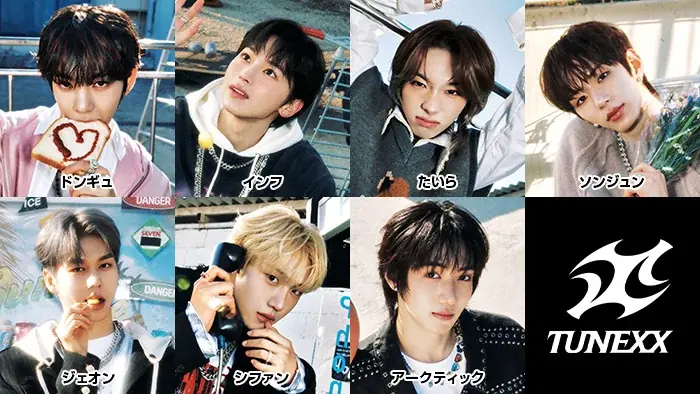 TUNEXXは、世界的に注目を集めたK-POPオーディション番組「BOYS II PLANET」に出演して注目を集めた4人(ドンギュ、インフ、シファン、アークティック)と、たいら、ソンジュン、ジェオンの合計7人で構成されています。7人中6人が2005年生まれで、メンバーのうち1人(たいら)は日本人です。この年齢構成と国籍の多様性も含め、デビュー前から話題となっていました。