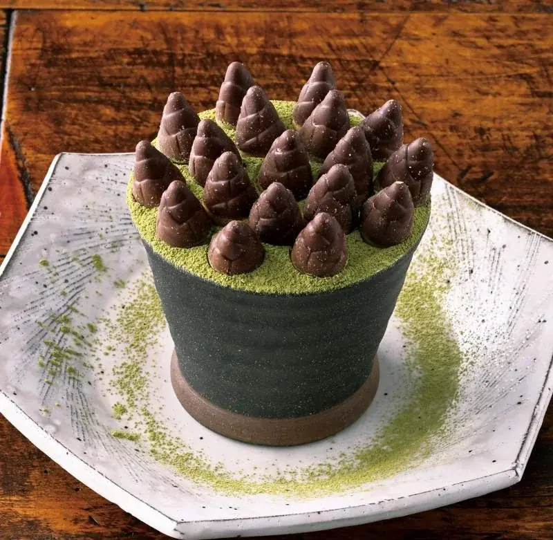 | たけパフェ | 698円(税込768円) | 筍をモチーフにしたチョコレートの飾りをあしらったミニパフェ。春の竹林に顔を出すたけのこ群を想起させる見た目の楽しさとデザートとしての甘さを併せ持ちます。 |