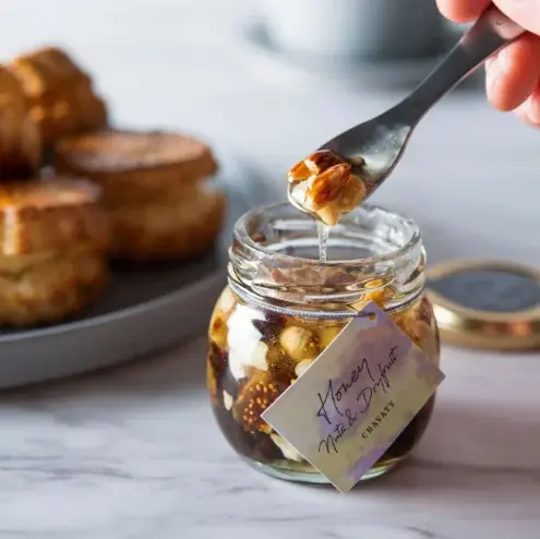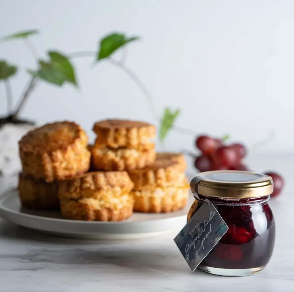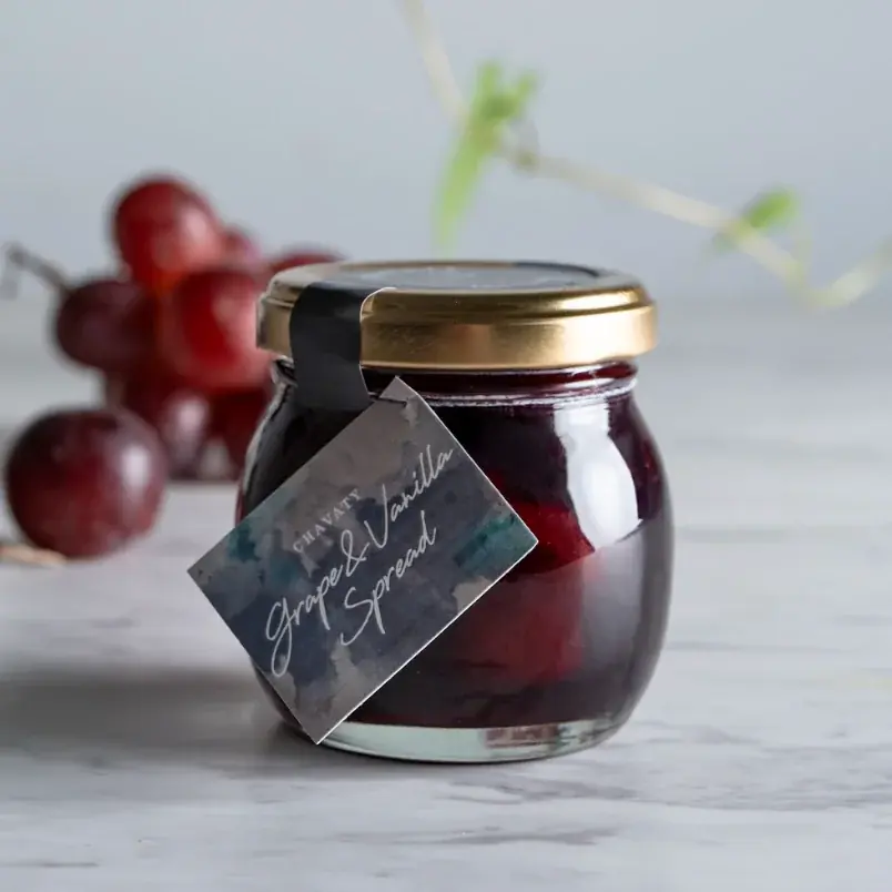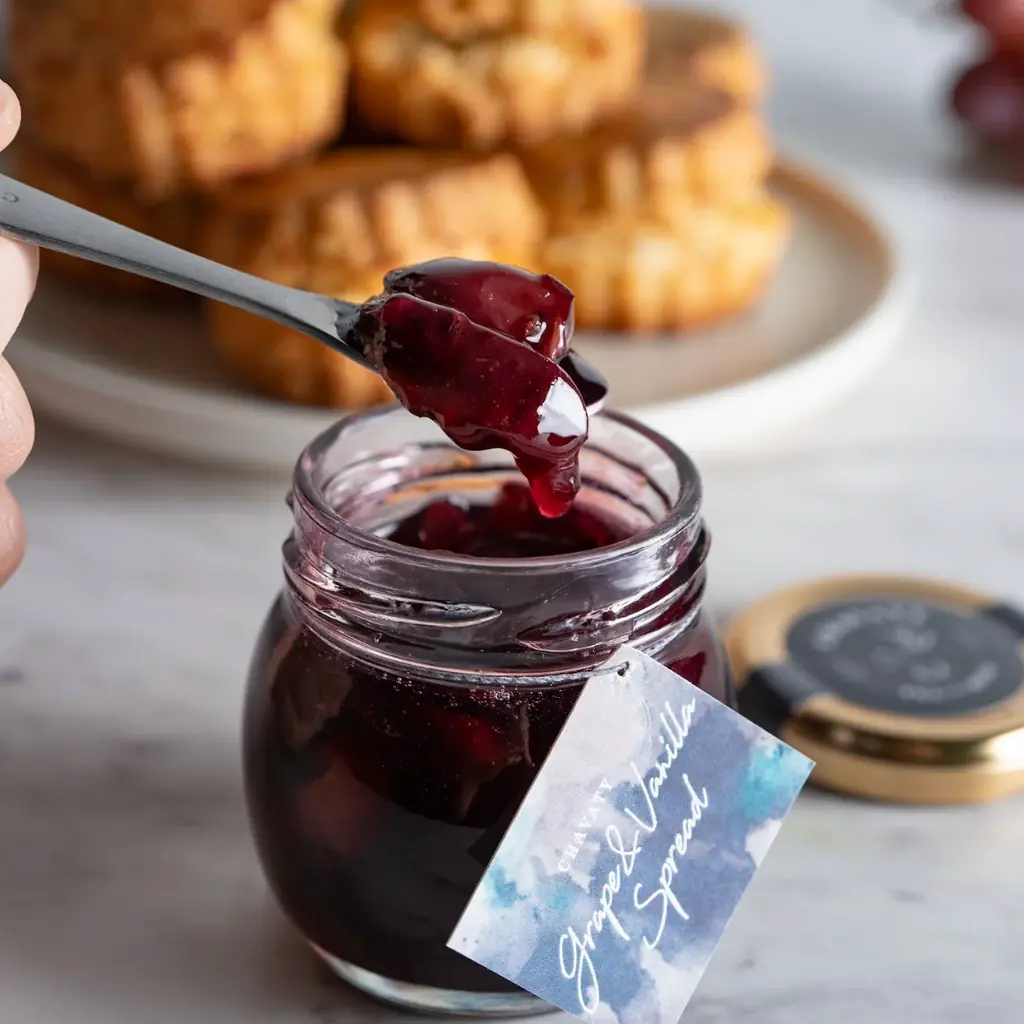 次にご紹介するのは、CHAVATYオリジナルのぶどう&バニラスプレッドです。赤ぶどうを丸ごと使用し、濃厚なスプレッドに仕上げました。バニラの芳醇な香りが加わることで、より深みのある味わいを実現しています。このスプレッドは、プレーンスコーンとの相性が抜群で、温めたスコーンにたっぷりのせて楽しむことができます。