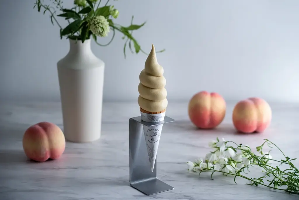 白桃ジャスミンティーソフトクリームは、岡山県産の白桃を使用し、ジャスミン茶の最高ランク「銀毫」の茶葉を合わせた贅沢な一品です。とろけるような果肉と華やかな香りが楽しめるこのソフトクリームは、税込680円で提供されています。テイクアウトのみの販売となります。