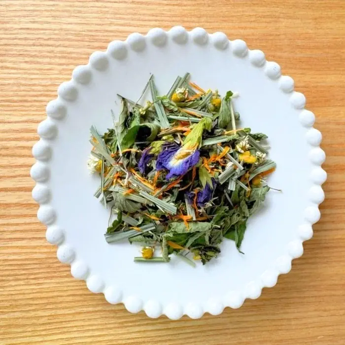 このハーブティーは、ノンカフェインで、香料、甘味料、保存料は一切不使用です。具体的な成分は以下の通りです。