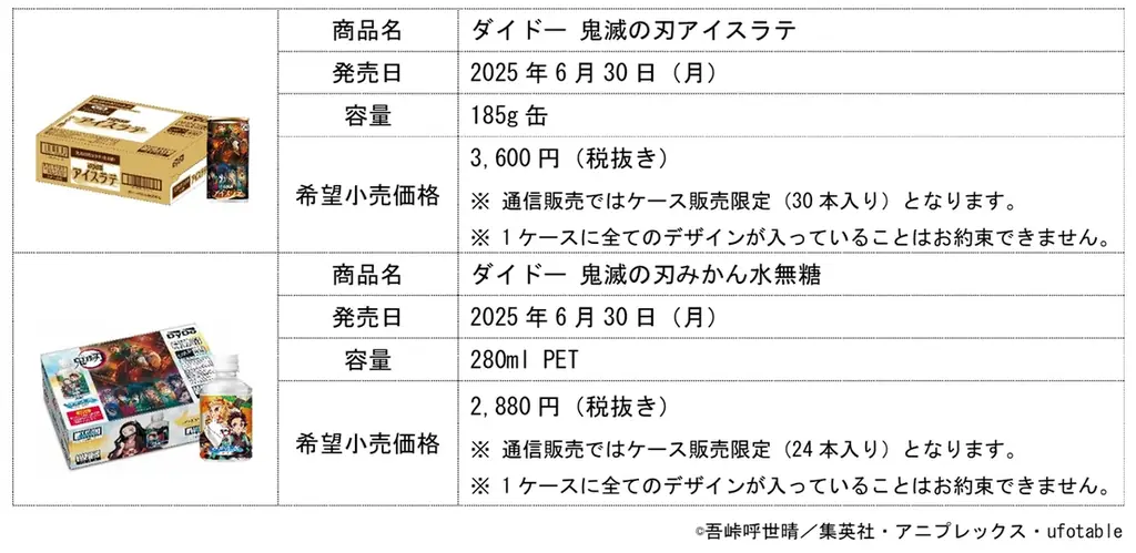 2025年6月30日発売の「ダイドー 鬼滅の刃アイスラテ」と「ダイドー 鬼滅の刃みかん水無糖」の2種類で、全32種類のキャラクターデザインが楽しめます。