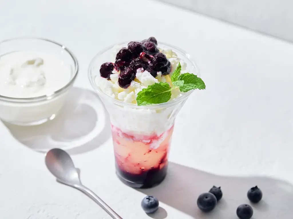 青紫・白・緑の爽やかなカラーコントラストが映えるこのグラニータは、クリームチーズとヨーグルト、コンデンスミルクを合わせた自家製のグラニータです。レモン果汁を効かせたジュレがぷるっとした食感を生み出し、旬のブルーベリーの優しく甘酸っぱいソースが最後まで心地よい清涼感を提供します。トッピングに添えたフレッシュミントの葉が爽快な香りを放ち、夏の暑さを和らげます。