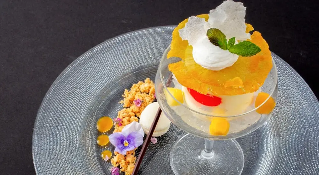 このイベントでは、特に「Lueur de l’aube(リュール・ド・ローブ)」というグラニテとパッションフルーツやマンゴーを使用したグラススイーツが登場します。このスイーツ名の意味は「夜明けの光」で、グラニテのきらめきと朝の海の爽快さを表現しています。