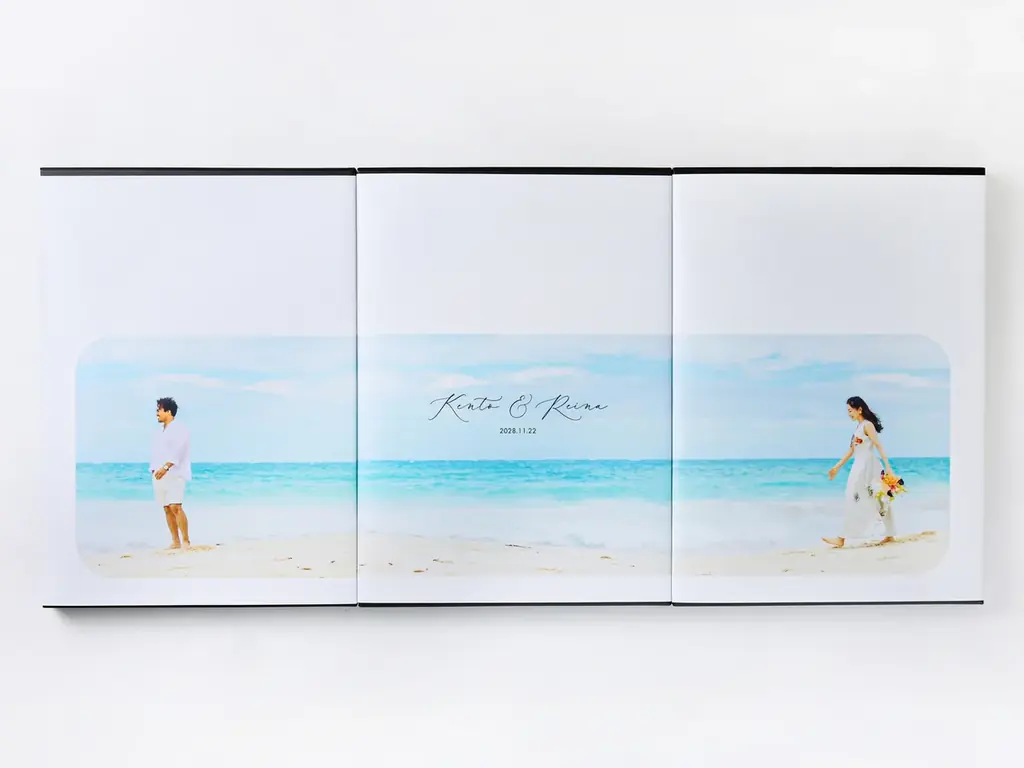 家族の絆をつなげる記念の贈り物として、本人用と両家親御様用をイメージした3冊セットのアルバムです。ケースカバーは3つ並べるとつながるデザインになっており、特別感を演出します。