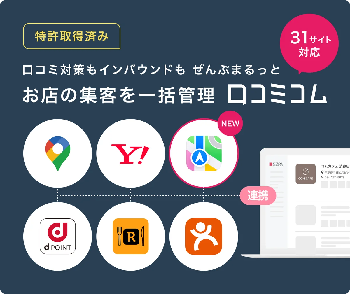 | 口コミコムの特徴 | 31サイト連携、一元管理、インバウンド対応 |