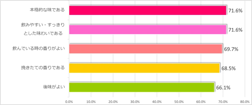 2025年3月に実施された日本インフォメーション株式会社によるアンケート調査では、セブンカフェのイメージに関する評価が高いことが明らかになりました。特に「本格的な味わい」「すっきりとした飲みやすさ」「香りのよさ」が上位に挙げられています。