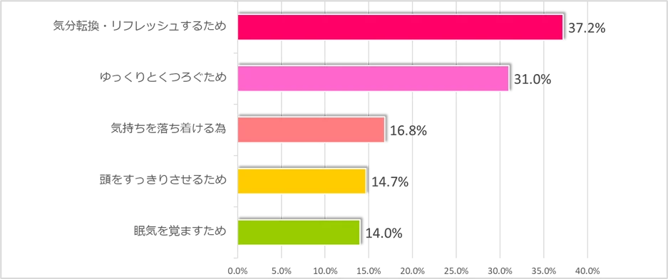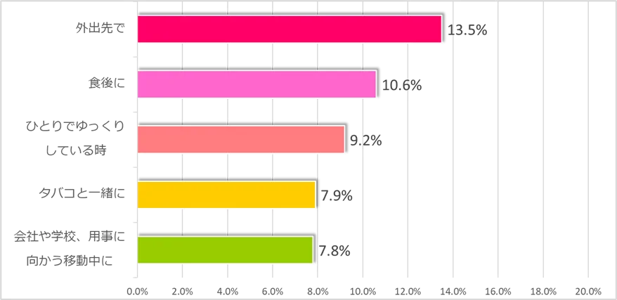 また、セブンカフェの利用場面や目的も多岐にわたります。外出先での利用が最も多いものの、さまざまなシーンで楽しむことができることがわかりました。利用目的としては、「気分転換・リフレッシュ」や「ゆっくりくつろぐ」といった回答が多く、特に集中したい時に飲まれることが多いことも示されています。