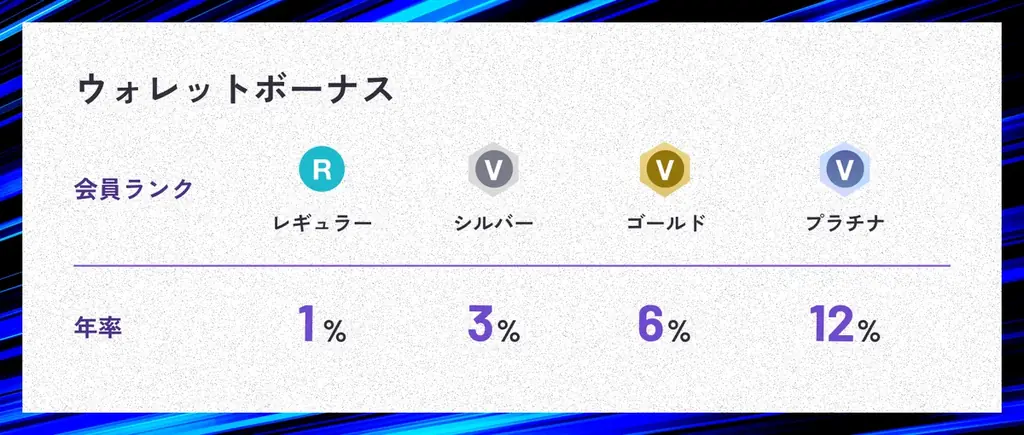 ウォレット機能の導入に伴い、新たな特典として「ウォレットボーナス」制度も開始されます。この制度では、ユーザーのコイン残高に応じて、通常コインに対して年率最大12%のボーナスコインが毎月付与されます。