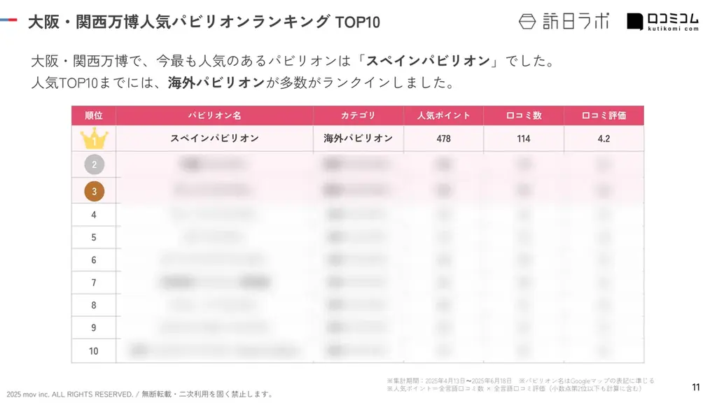 2025年6月25日、株式会社movが発表した最新の調査結果によると、大阪・関西万博における人気パビリオンランキングのトップは「スペインパビリオン」となりました。この調査は、業界最大級のインバウンドビジネスメディア「訪日ラボ」と、店舗向け集客一元化プラットフォーム「口コミコム」によって実施されました。