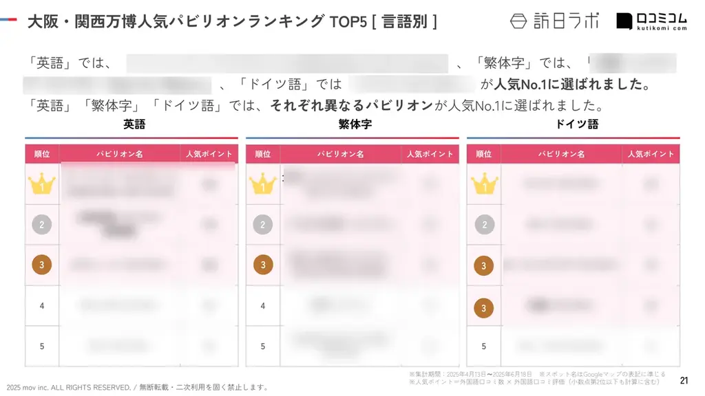調査対象は、訪日ラボが独自に選出した大阪・関西万博の189のパビリオンで、口コミは2025年4月13日から2025年6月18日までにGoogleマップから収集され、合計3,981件の口コミが分析されました。その中で、外国語の口コミは1,037件を占めています。