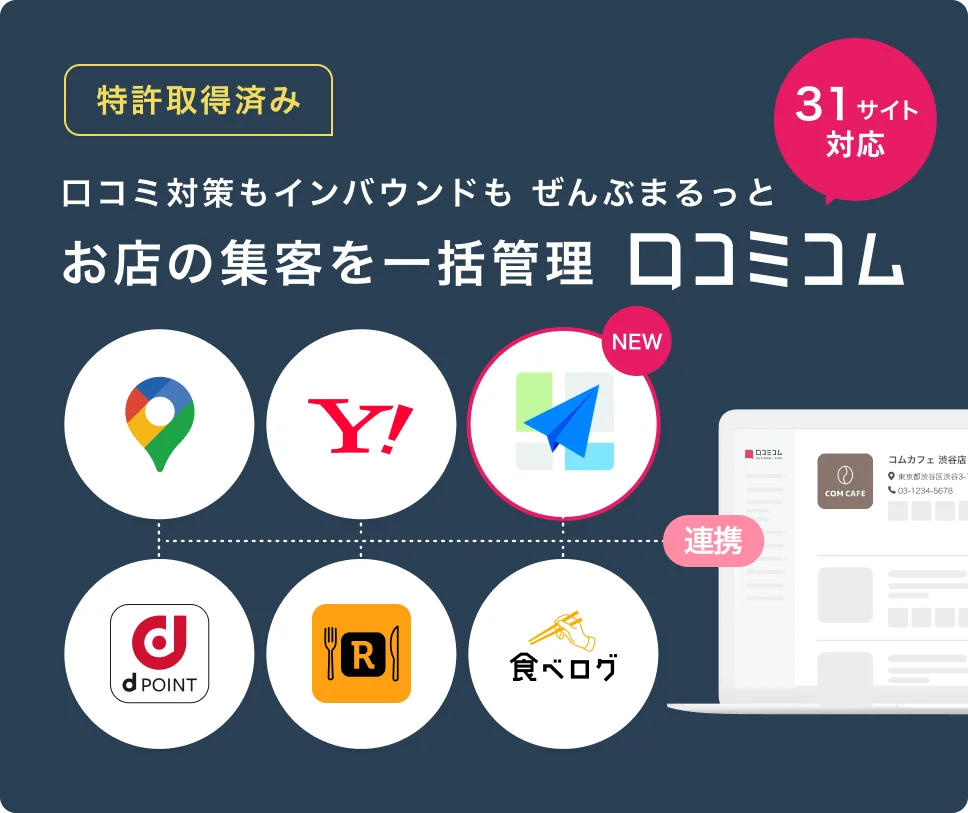 口コミコムは、国内外の口コミサイトを活用し、店舗向けの集客を一元化するプラットフォームです。このサービスは、口コミ分析データをもとにした店舗改善や集客数の増加を支援します。さらに、インバウンド向けに多言語での店舗情報整備や口コミ分析を行うことができます。