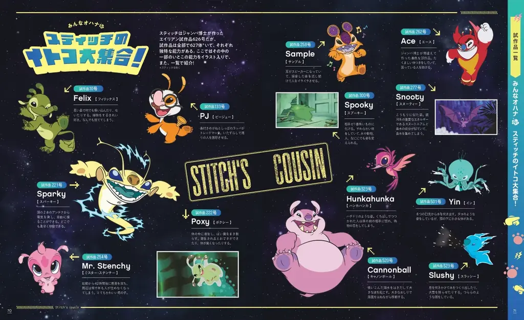• 特別メッセージ: 声優の山寺宏一さんによるスティッチ愛が伝わるメッセージや、スティッチの627体のイトコ一覧、エンジェル&リロイの紹介なども収録されています。