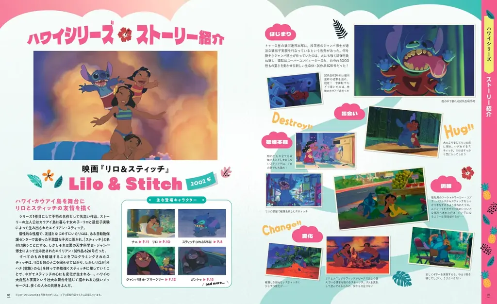 『るるぶスティッチ』は、映画『リロ&スティッチ』をはじめとするハワイシリーズやTVアニメの沖縄編シリーズのキャラクターやストーリーを、シーン画像と共に紹介する内容となっています。具体的には、以下の内容が含まれています。