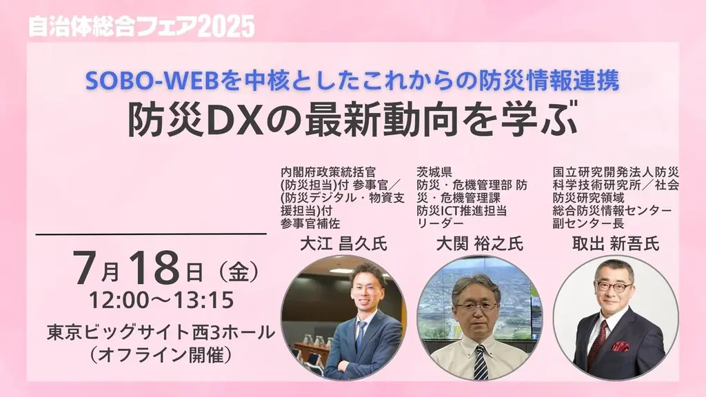 さらに、7月18日(金)には、内閣府・防災科研・茨城県の防災担当者が集結し、「防災DXの最新動向を学ぶ ~SOBO-WEBを中核としたこれからの防災情報連携~」というセミナーも開催されます。このセミナーでは、最新の防災情報連携の動向について事例を交えてわかりやすく紹介します。