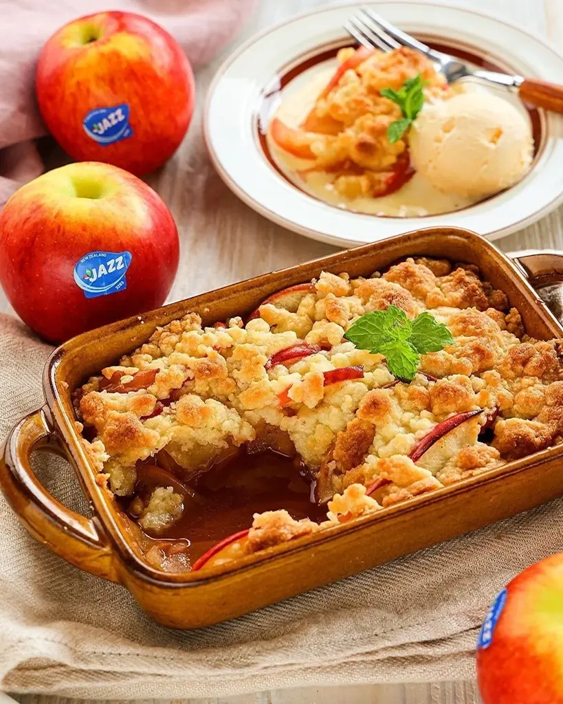 4. 耐熱皿にりんごを入れ、クランブルを広げてのせる。予熱したオーブンで20〜25分焼き、アイスクリームとミントを添える。