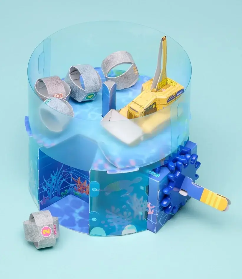 コマツとコラボした水中施工ロボットの組み立て紙付録で、ガチャガチャのように遊びながら未来の重機の動きを体験できる内容です。