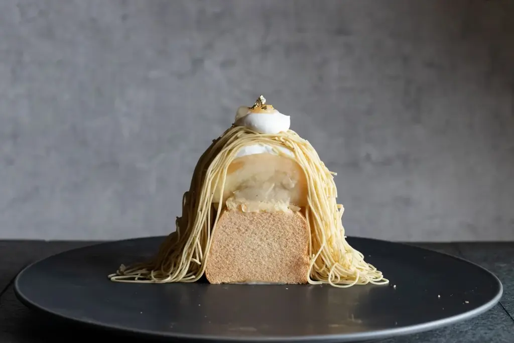 「モンブランソフト」は、自家製ブレンドのソフトクリームにサクサクのメレンゲとほろほろのシュトロイゼルを加えたデザートです。なめらかな味わいと変化に富んだ食感が楽しめる一品で、厳選した桃を添えたデザートとして提供されます。