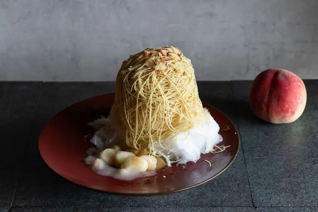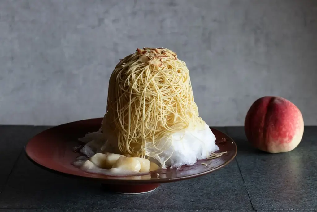 「モンブラン桃氷」は、和栗の濃厚な風味とみずみずしい桃の甘さが絶妙に調和した、暑い季節にぴったりの一品です。厳選した国産桃を使用したふわふわのかき氷の上に、宮崎県えびの産の国産和栗をお絞りしており、特別な夏のデザートとしておすすめです。