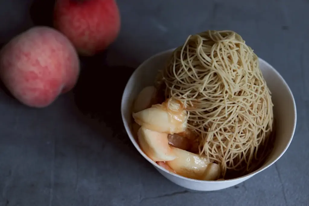 モンブラン桃氷 ¥3080 国産桃を使用したふわふわのかき氷に和栗を絞ったデザート。