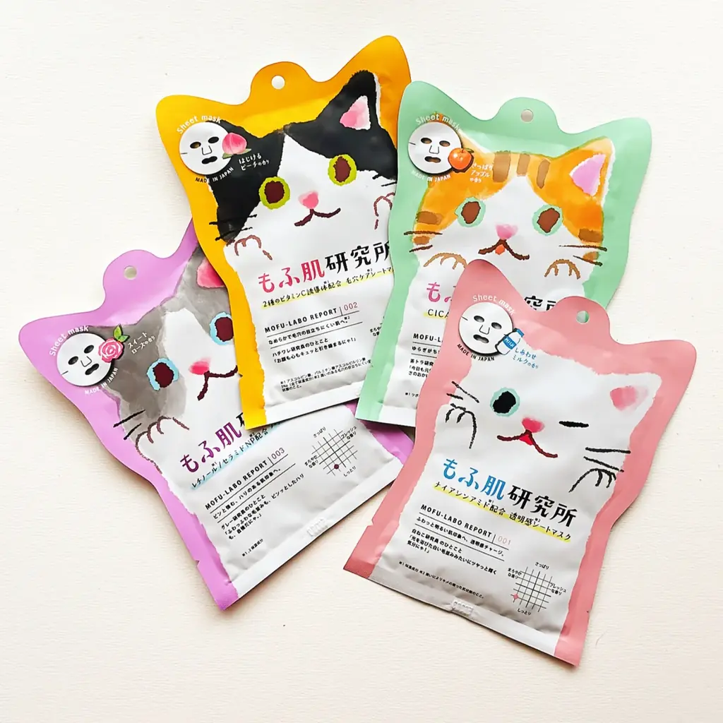 「もふ肌研究所」シリーズは、トラブル肌にも優しく寄り添うシートマスクです。ねこ型のパッケージが特徴的で、可愛らしさがスキンケアの時間を楽しくしてくれます。以下の4つのケアタイプが用意されています: