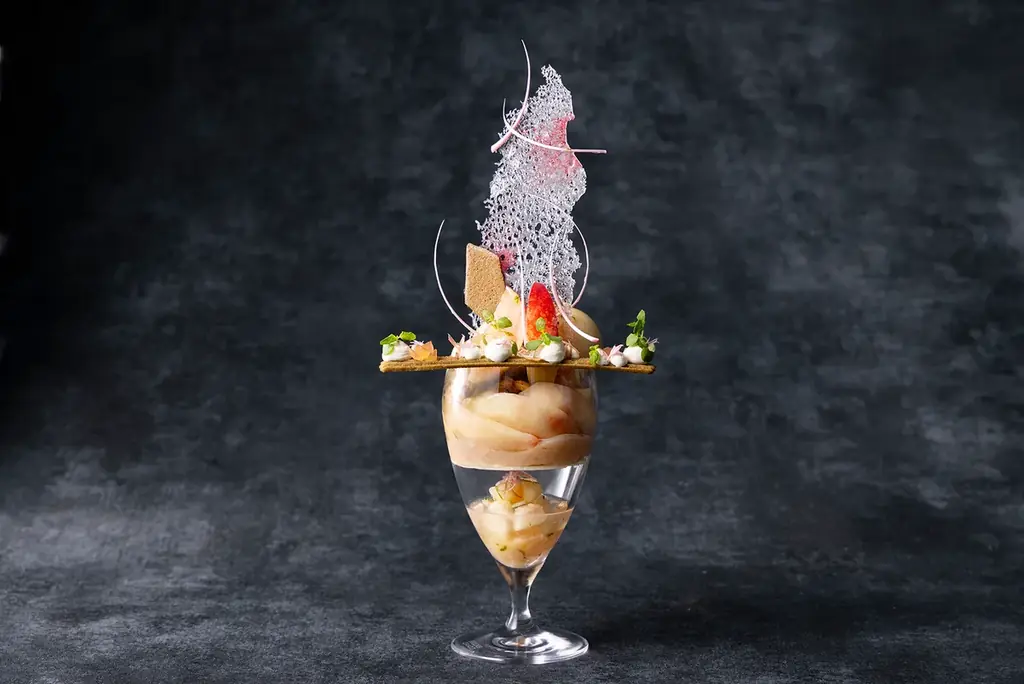 さらに、大葉やすだち、2種の異なるほうじ茶といった素材を組み合わせることで、桃の瑞々しさに奥行きと爽やかさを加え、多層的な香りと食感を楽しめるよう工夫されています。まさに「宝石のように美しいパフェ」というコンセプトが体現されています。