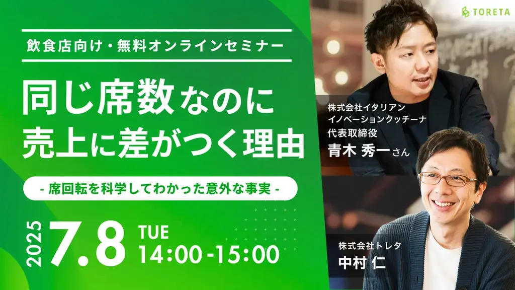 株式会社トレタは、2025年7月8日14時からオンラインにて「同じ席数なのに売上に差がつく理由~席回転を科学してわかった意外な事実~」というセミナーを開催します。このセミナーでは、飲食店経営者や関係者に向けて、売上1.2倍を実現したテーブルマネジメントの実践術を公開します。