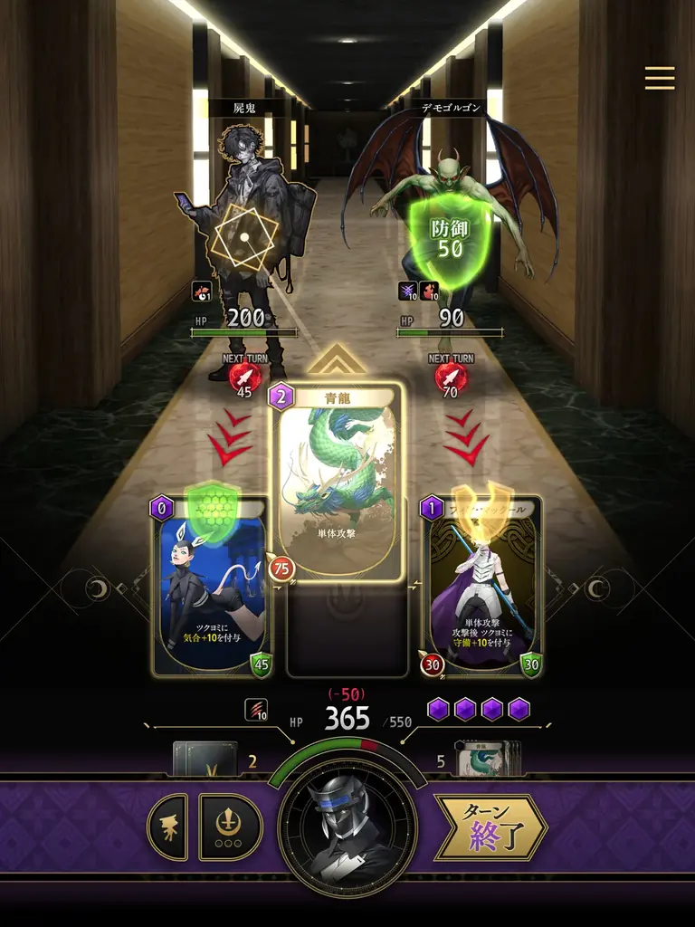 戦闘はターン制のカードバトルで、山札からランダムに配布されるカード「神魔札」を戦況に応じて使い分けることが求められます。プレイヤーは、攻撃や防御を選択し、スピーディーかつ戦略的なバトルを楽しむことができます。