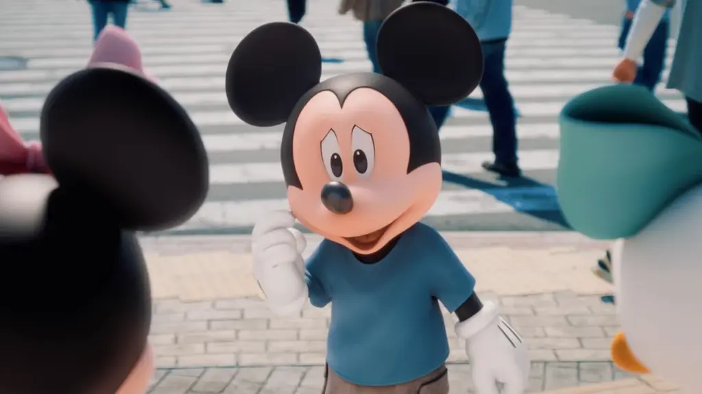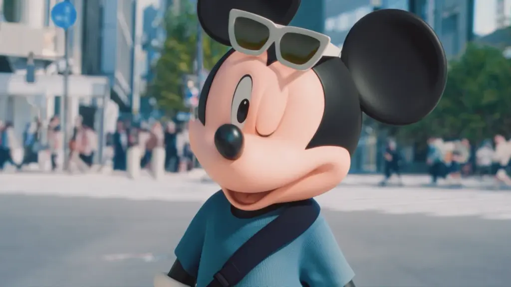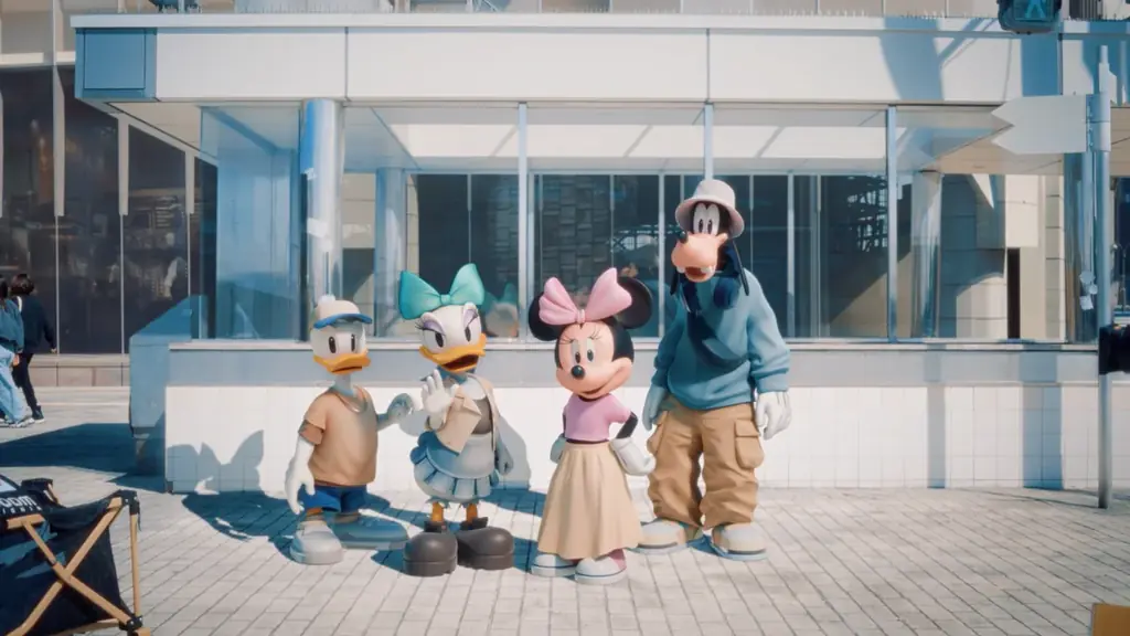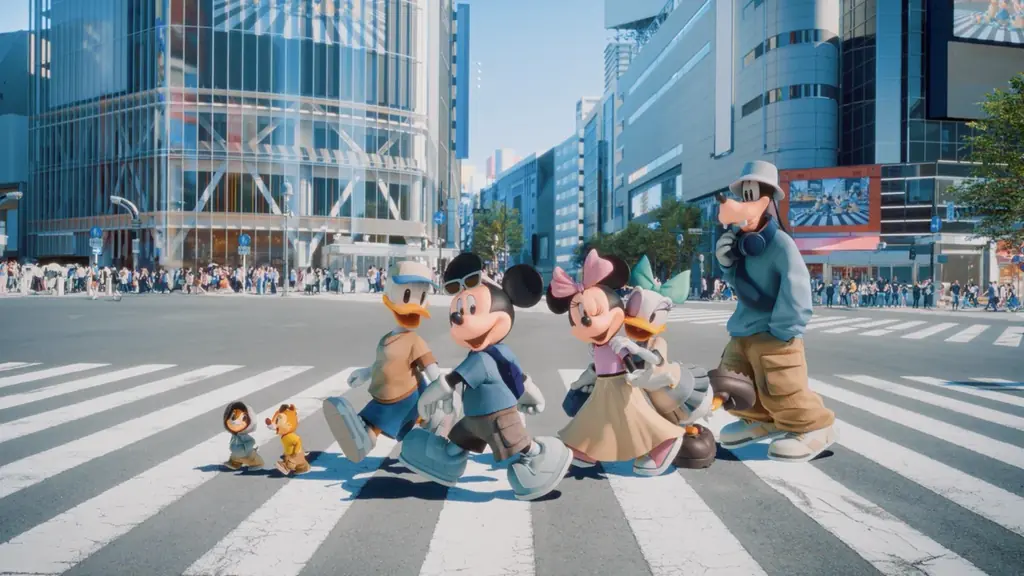 2025年7月1日から放送される新CMでは、ミッキー&フレンズが渋谷の街中でリアルに描かれ、ミッキーが寝坊して慌てる姿や撮影風景が楽しく表現されています。