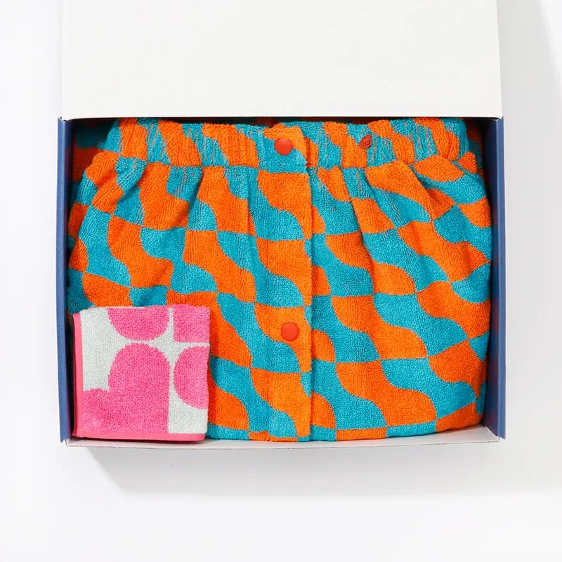 夏の水遊びやプールに欠かせないアイテムで、コットンとレーヨンの異なる糸を撚り合わせて作られています。柔らかで独自の風合いを持ち、旅先でも目を引くキャッチーなカラーリングが特徴です。