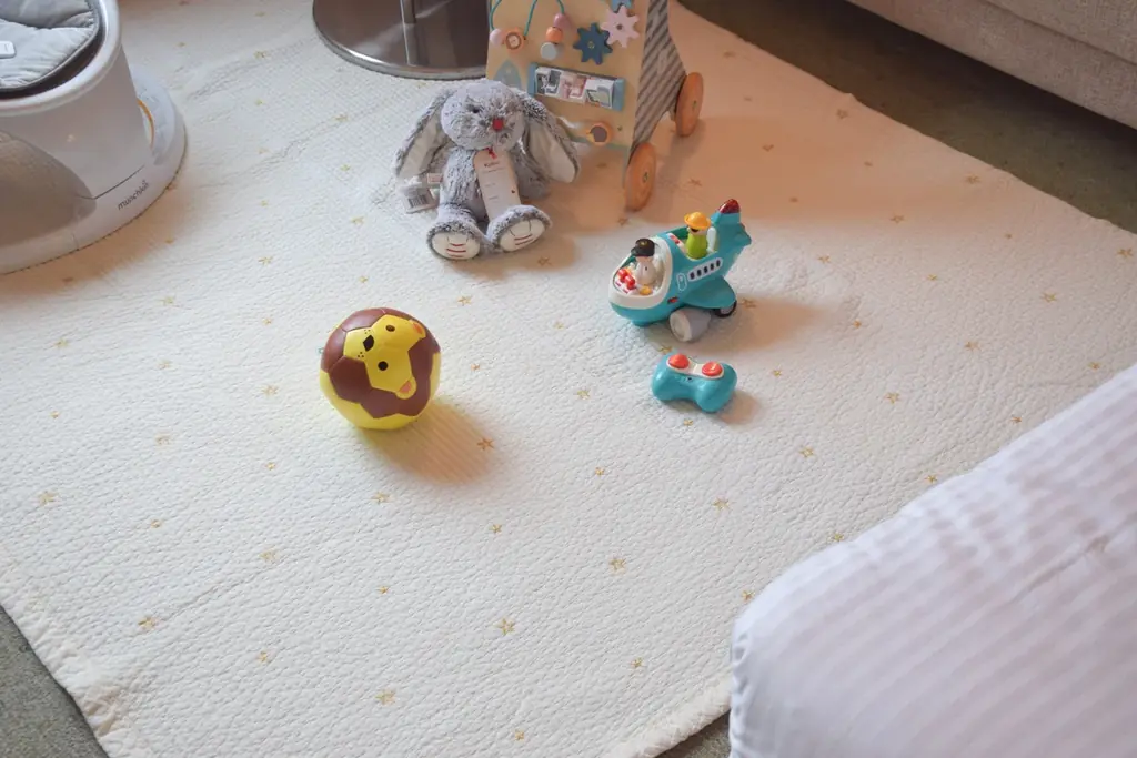 D by DADWAYの大判イブルマットを敷いており、靴を脱いでリラックスできる空間を提供します。おもちゃも豊富に用意されており、快適な遊び場が広がります。