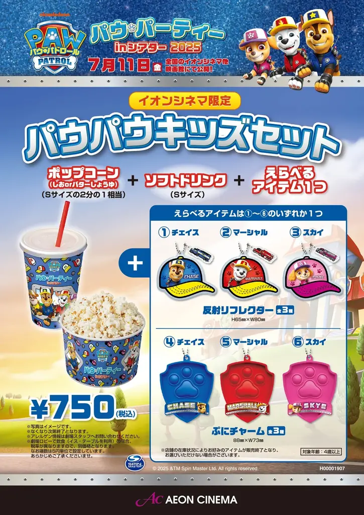 飲食売店では、ポップコーンとソフトドリンクに加えて、選べるアイテムがセットになった「パウパウキッズセット」が販売されます。このセットは750円(税込)で、同じく7月11日からの販売です。内容は以下の通りです。