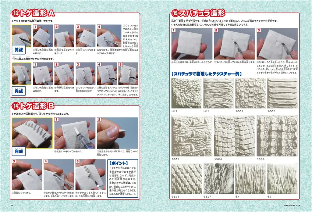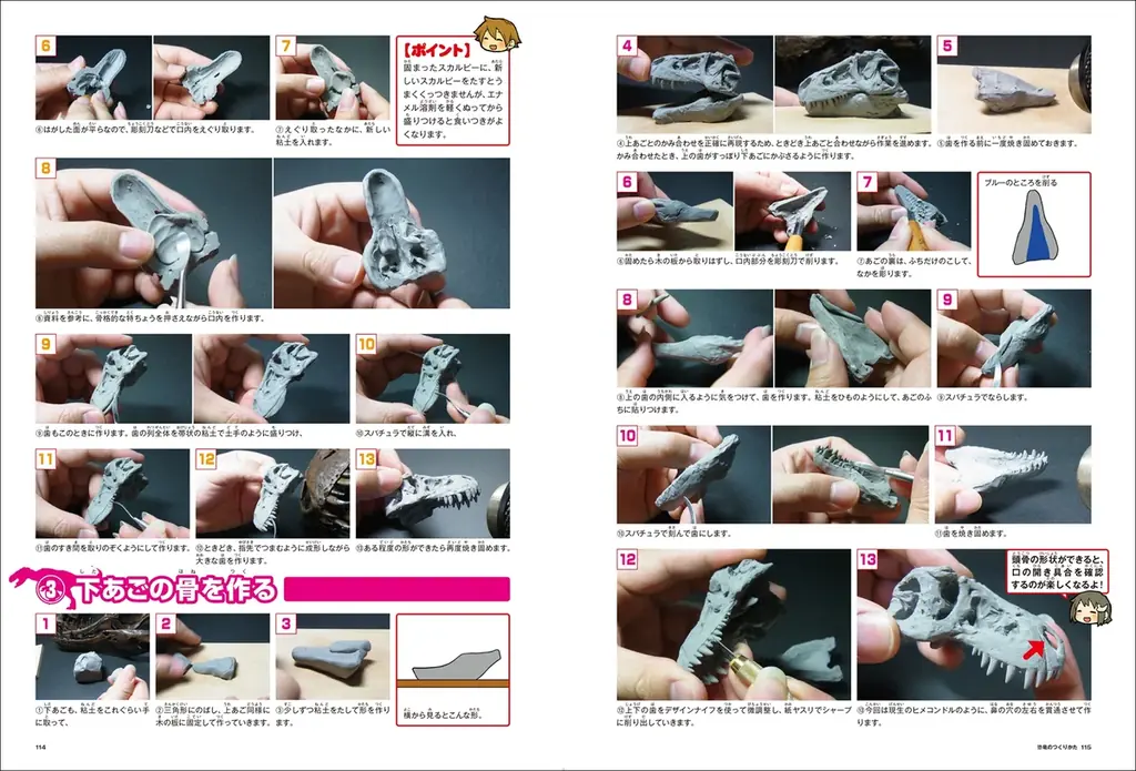 本書では、作業の手順ごとにテクニックやコツを細かい写真付きで説明しています。恐竜の骨格を観察しながら、どのように立体的に造形していくかを学ぶことができます。特に、リアルな恐竜に見せるためのテクスチャ―(表面の質感)の作り方についても詳しく解説されており、細かいテクニックを習得することが可能です。
