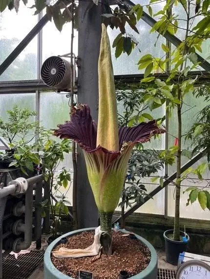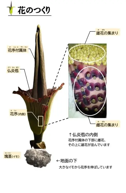 今回の開花予想時期は2025年7月上旬であり、実際の花の見ごろは開花日を含めて2~3日程度とされています。特に2日目には仏炎苞(ぶつえんほう)が閉じ始めるため、観覧を希望する方は早めの訪問をおすすめします。