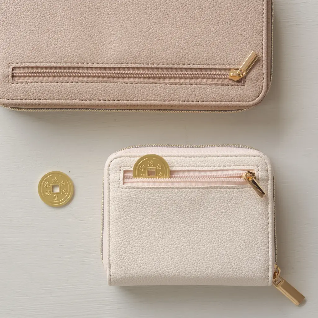 ミニ財布は優しいカラーとゴールドの引手が特徴で、さりげない華やかさを演出します。長財布は後ろポケットに御守りや種銭を収納できる機能も備えています。また、お財布の中央には蛇窪神社の社紋プレートが付き、特別感を演出しています。