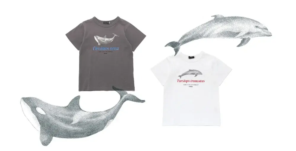 | シャチ・イルカ図鑑風半袖Tシャツ | ¥6,600(税込) | 80㎝~140㎝ | ホワイト・グレー |