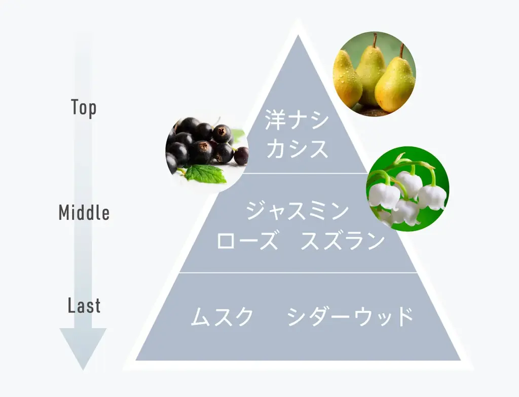『ソワンクラージュ タイトウエア』は、フローラル・フルーティの香りが特徴です。みずみずしさの中に華やかさが感じられる気品ある香りに仕上げられており、リラックスした気持ちでお手入れを楽しむことができます。