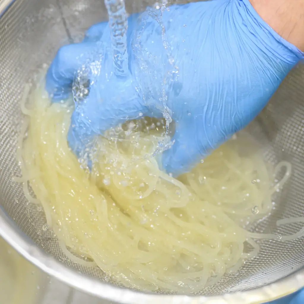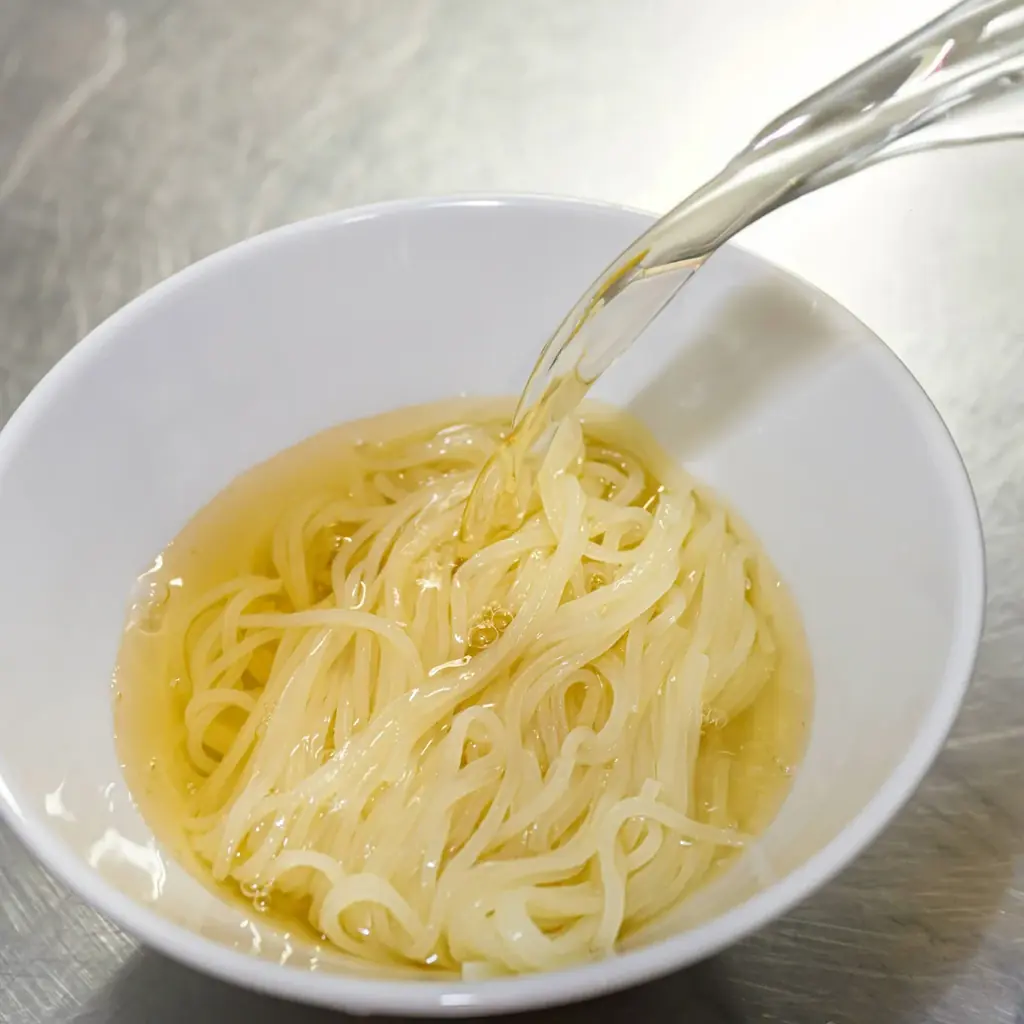 『鶏だし冷麺』の人気の秘密は、その独特の食感と味わいにあります。盛岡から直送される生麺は、ツルツルとした喉越しと、噛むほどにもっちりとした弾力が特徴です。この生麺は、冷麺の本場から特別に取り寄せられています。